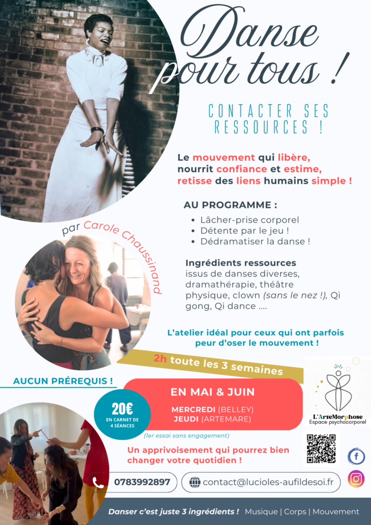 1- Des corps , 2- de la musique, 3- Du mouvement. Rien de + ! Rien à prouver juste à ressentir et libérer. Loin des codes sociaux ou des cours chorégraphiés, j’ai à coeur plus que tout de vous ouvrir cette porte vers cette liberté d’expression sensorielle qui rend tellement vivant et libre ! De facilité par un cadre progressif, par le jeu, par la curiosité, votre exploration vers une reconnexion à tout ce qui bouillonne en vous, et pouvoir l’exprimer au delà des mots par le mouvement.